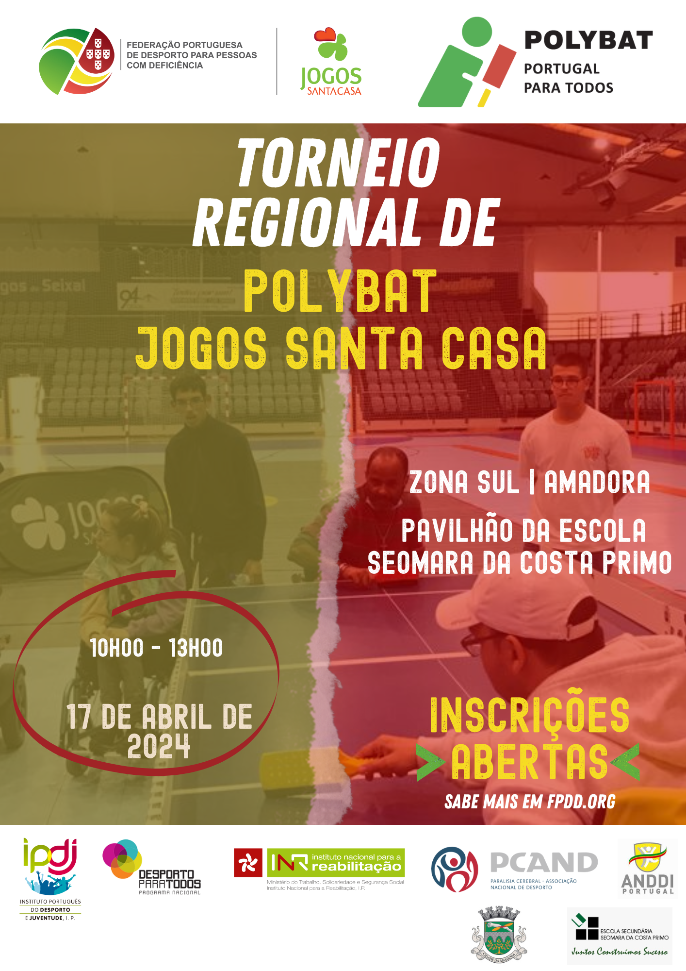 No âmbito do projeto “Polybat Portugal para Todos”, a Federação Portuguesa de Desporto para Pessoas com Deficiência (FPDD), numa parceria com a ANDDI-Portugal e a PCAND, realiza o “1º Torneio de Polybat Zona Sul Jogos Santa Casa”, no dia 17 de abril, das 10h00 às 13:00h, no Pavilhão Escola Seomara da Costa Primo, na Amadora.