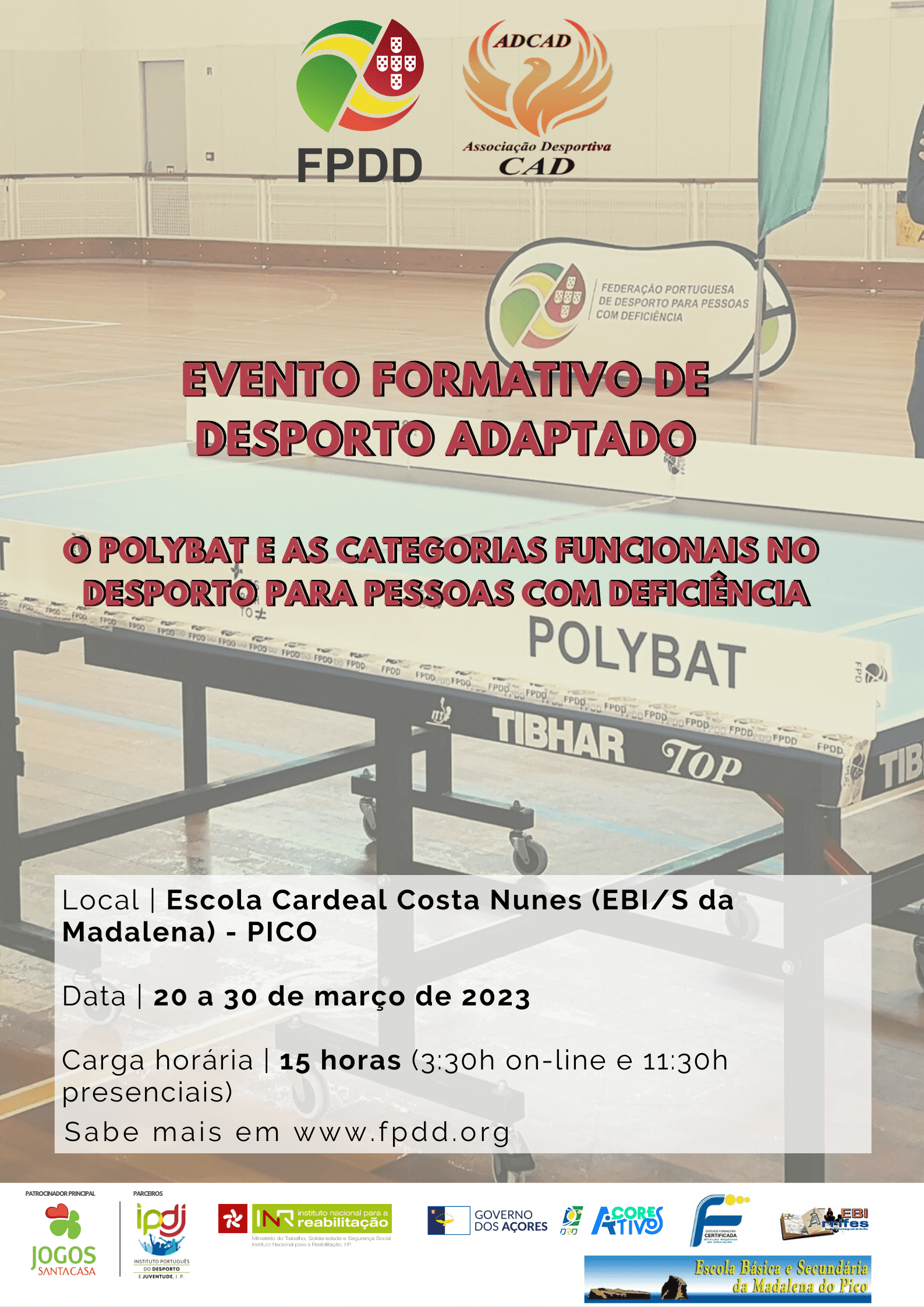 Estão abertas até ao dia 15 de março as candidaturas para a 2.ª edição da formação: «Desporto Adaptado: O Polybat e as categorias funcionais no desporto para pessoas com deficiência (escolas e clubes)», que decorre em regime misto (online e presencial) nos dias 20 de março (online), 23 e 24 de março de 2023 (presencial) na Escola Cardeal Costa Nunes (EBI/S da Madalena), no Pico e dia 30 (online).