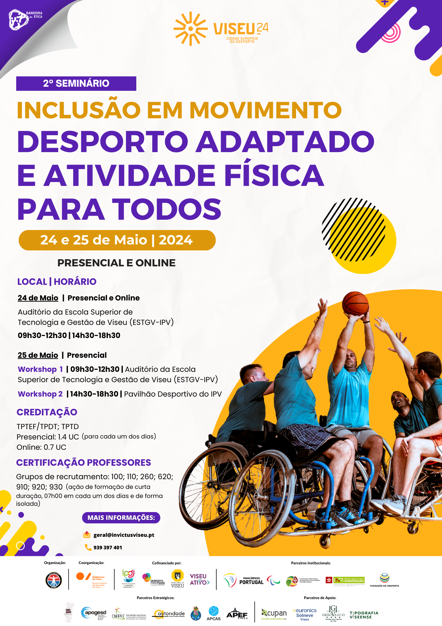 No ano em que Viseu é Cidade Europeia do Desporto 2024 (Viseu CED24), a Associação Invictus Viseu e a Escola Superior de Educação de Viseu (ESEV) – Departamento de Ciências do Desporto e Motricidade, fruto do sucesso apurado na 1ª edição (2023), voltam a organizar conjuntamente, o Seminário “Inclusão em Movimento: Desporto Adaptado e Atividade Física para Todos”, sua 2ª Edição, nos dias 24 e 25 de maio 2024, sendo palco do primeiro dia do evento (24 de maio), o Auditório da Escola Superior de Tecnologia e Gestão de Viseu (ESTGV) do Instituto Politécnico de Viseu (IPV). No que concerne à localização do 2º dia (25 de maio), no período da manhã, o Workshop nº1, decorrerá igualmente no Auditório da ESTGV – IPV e o Workshop nº2, a decorrer no período da tarde do dia 25 de maio, terá lugar no Pavilhão Desportivo do IPV.