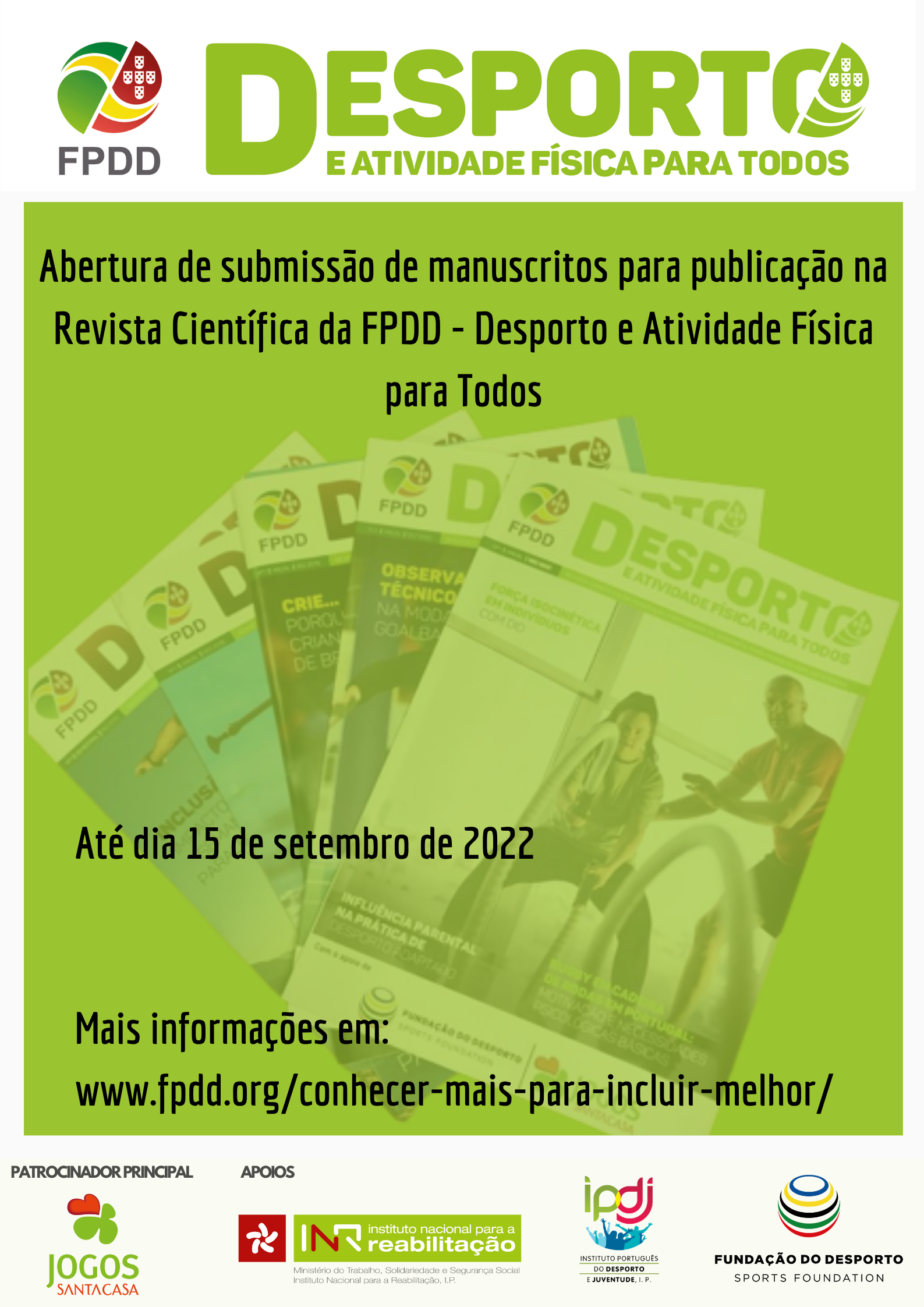 A Federação Portuguesa de Desporto para Pessoas com Deficiência vem divulgar a abertura da submissão de manuscritos para publicação na Revista Científica da FPDD – Desporto e Atividade Física para Todos.
