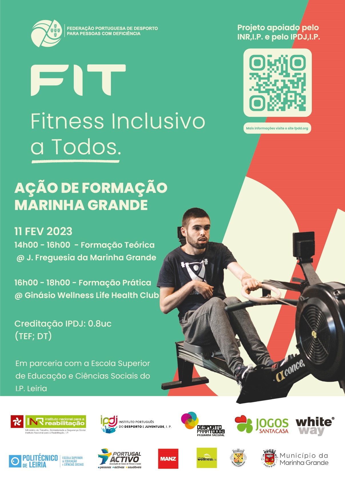 No âmbito do Projeto FIT — Fitness Inclusivo a Todos 2023, a Federação Portuguesa de Desporto para Pessoas com Deficiência (FPDD) em parceria com a Escola Superior de Educação e Ciências Sociais de Leiria (ESECS), irá organizar uma Ação de Capacitação, dirigida a Diretores Técnicos (DT) e Técnicos de Exercício Físico (TEF), que pretendam intervir no domínio da atividade física regular para Pessoas com Deficiência e Incapacidade.