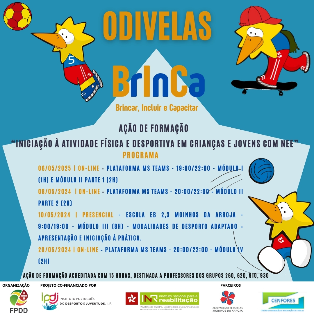 No âmbito do projeto BrInCa (Brincar Incluir e Capacitar) a FPDD realizará no concelho de Odivelas, a ação de formação “Iniciação à Atividade Física e Desportiva em Crianças e Jovens com NEE”, em formato b-learning, nos dias 6, 8, 10 e 20 maio.