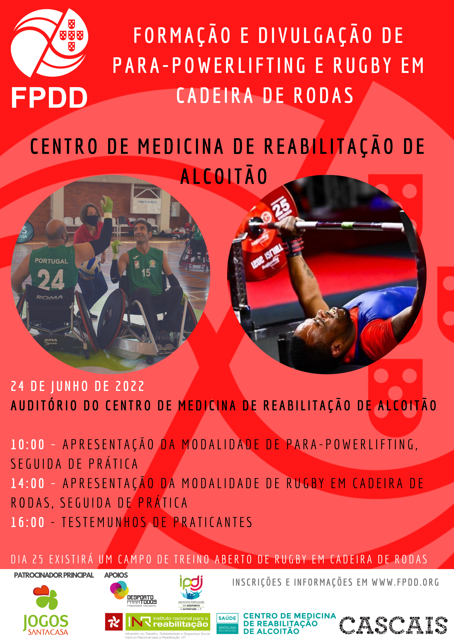 A FPDD, em parceria com o Centro de Medicina de Reabilitação de Alcoitão, vai organizar uma Ação de Formação e Divulgação das modalidades de Rugby em Cadeira de Rodas e Para-Powerlifting no Auditório do CMRA no próximo dia 24 de junho de 2022. Os interessados poderão efetuar a inscrição clicando aqui.