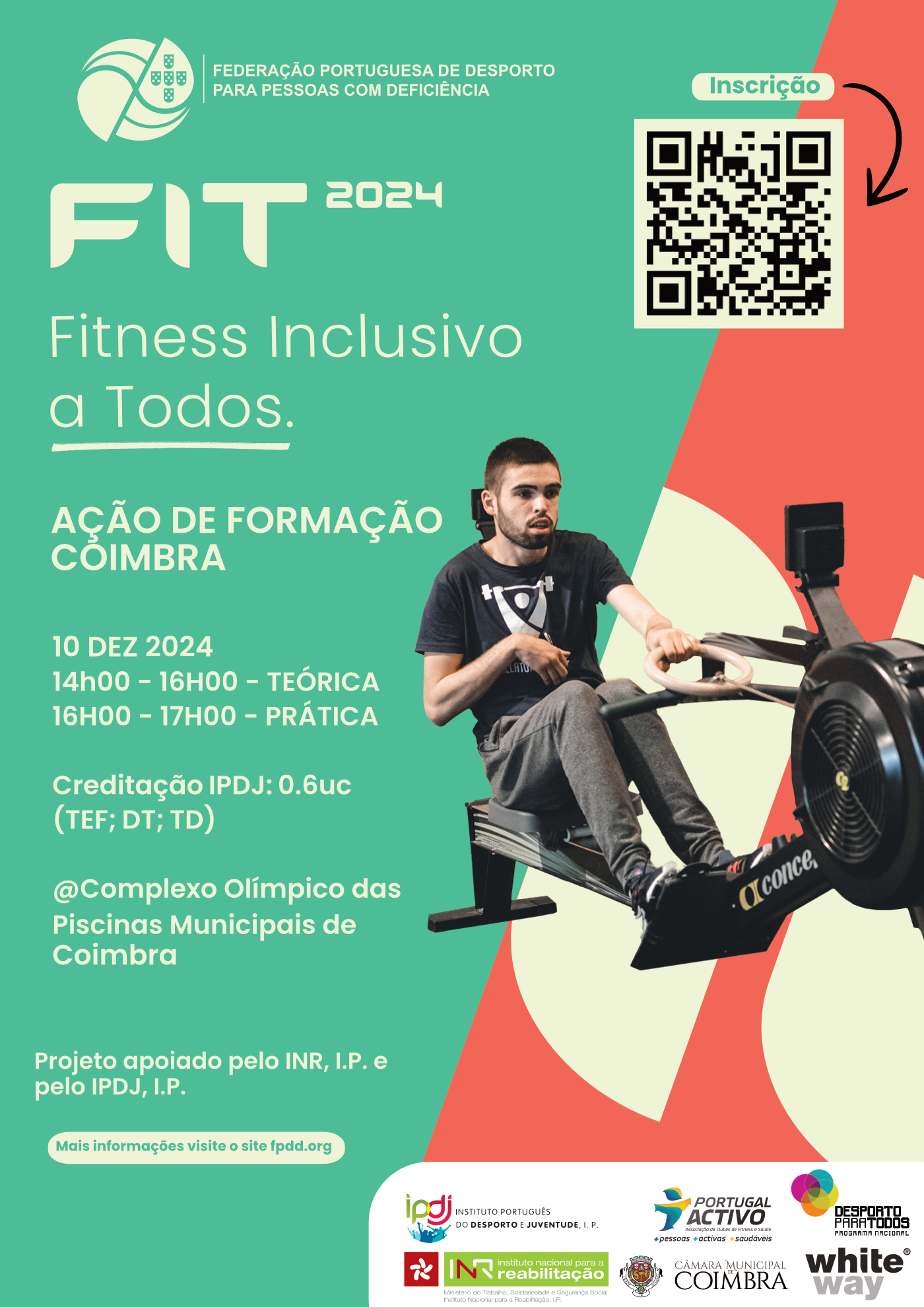 No âmbito do Projeto FIT — Fitness Inclusivo a Todos 2024, a FPDD em parceria com a Câmara Municipal de Coimbra e a Portugal Activo, irá organizar uma Ação de Formação, dirigida a Proprietários de Ginásios; Diretores Técnicos; Personal Trainers; Instrutores; Monitores; Treinadores; Professores de Educação Física e estudantes da área, que pretendam intervir no domínio da atividade física regular para Pessoas com Deficiência e Incapacidade.