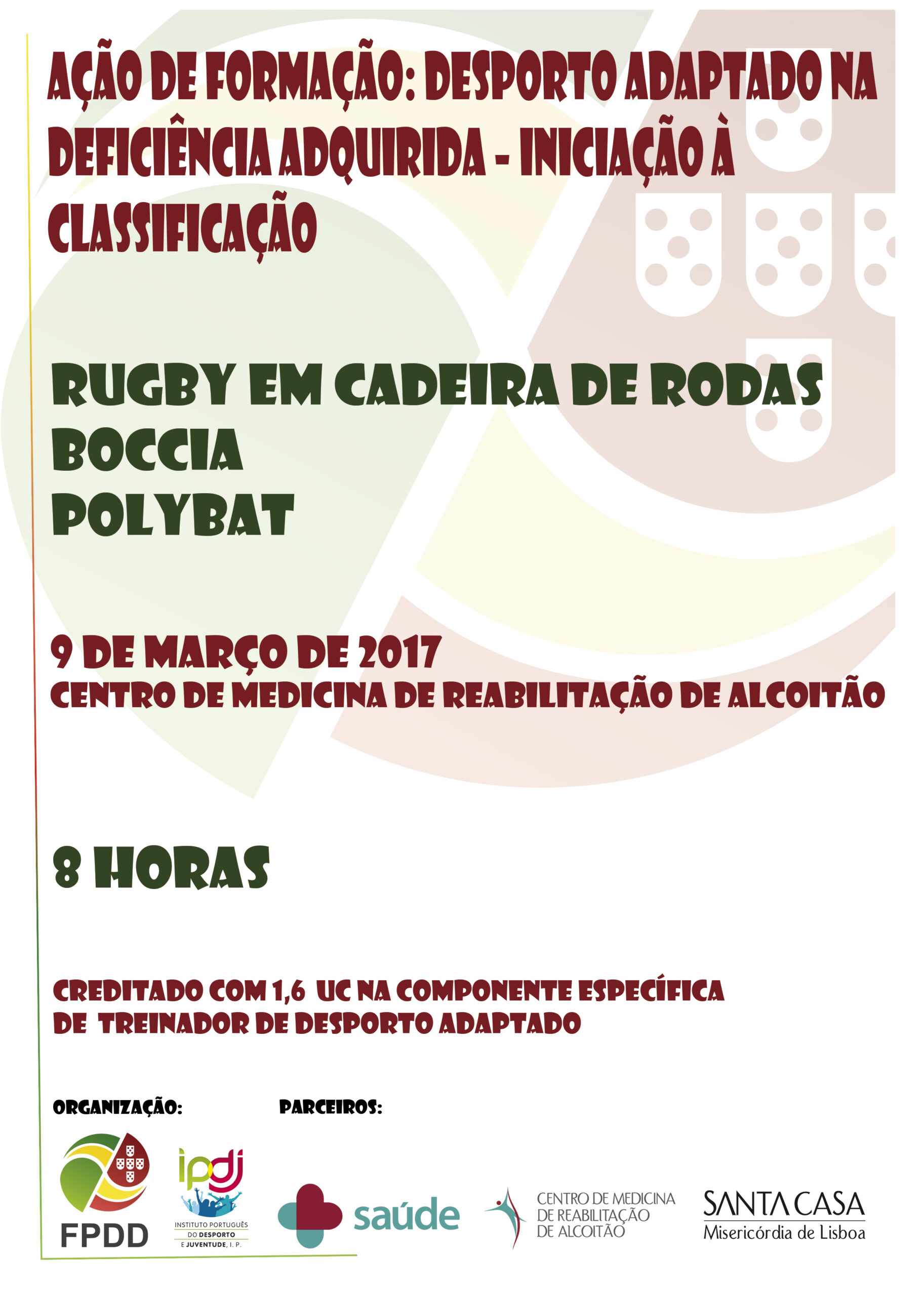 A FPDD vai organizar uma Ação de Formação denominada “Desporto Adaptado na Deficiência Adquirida – Iniciação à Classificação” no dia 9 de março, no Centro de Medicina de Reabilitação de Alcoitão, nas modalidades de Rugby em cadeira de rodas, Boccia e Polybat.