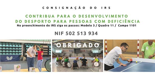 A Federação Portuguesa de Desporto para Pessoas com Deficiência (FPDD) é uma das entidades beneficiárias da consignação de 0,5 % do IRS. Pode fazê-lo no preenchimento do campo 1101, do quadro 11, do Modelo 3, indicando o NIF da FPDD – 502 513 934.