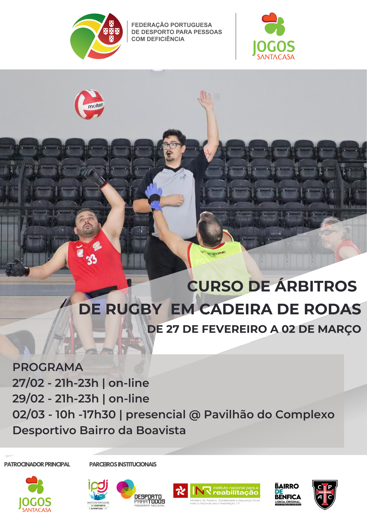 A FPDD irá realizar entre os dias 27 de fevereiro e 2 de março de 2024, um curso de árbitros de Rugby em Cadeira de Rodas. Este curso terá uma componente teórica on-line de 4h e uma componente prática presencial de 6h que se realizará no Pavilhão do Complexo Desportivo do Bairro da Boavista.