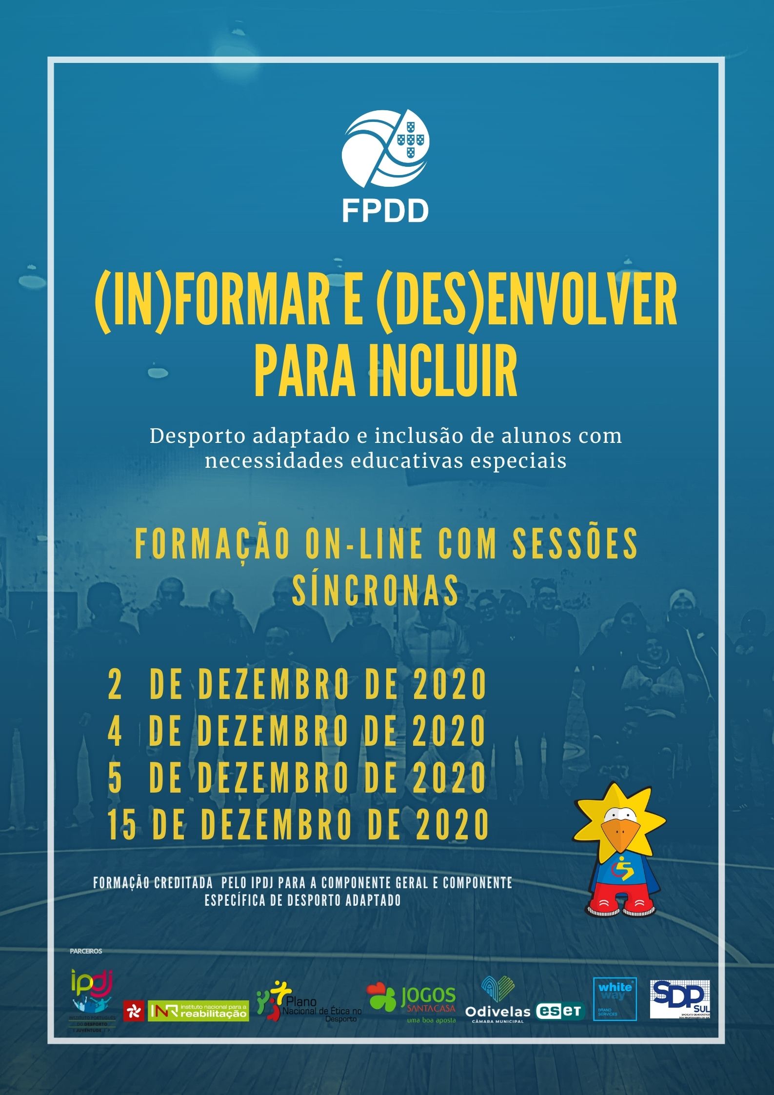 O projeto (In)formar e (Des)envolver para Incluir (IDI) da FPDD vai continuar em dezembro, em Lagos. Em colaboração com Sindicato dos Professores do Sul, vão realizar-se várias ações de formação síncronas e assíncronas, à distância, nos próximos dias 2, 4 e 5 de dezembro, culminando com a sessão de avaliação das aprendizagens a 15 de dezembro; estas ações são creditadas e dirigidas, em particular, aos professores do Sul do país, em particular para os do concelho de Lagos, mas também a treinadores e outros agentes.