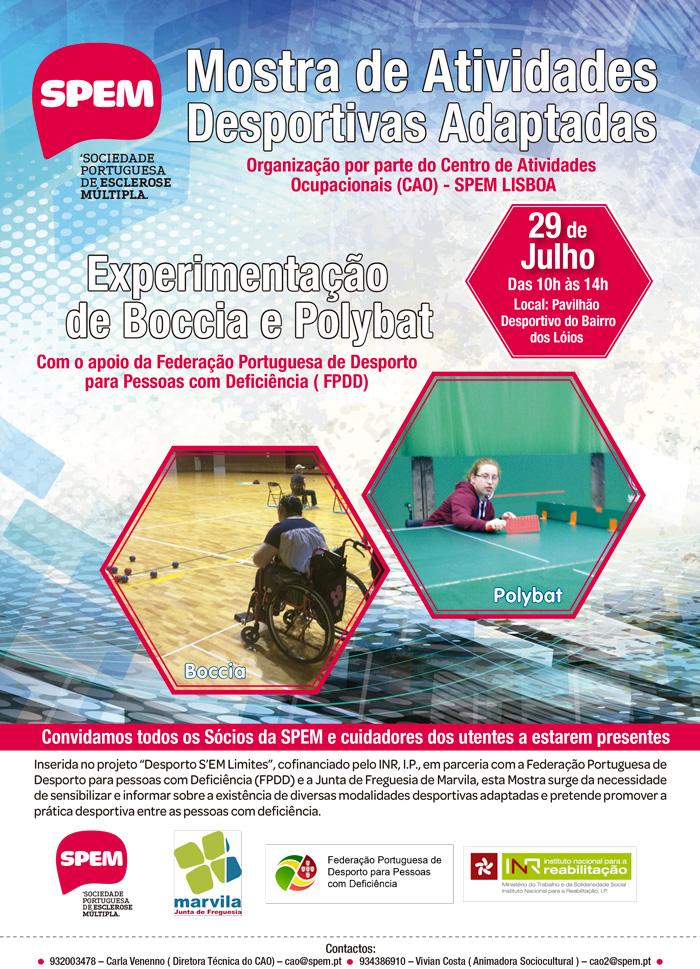 A FPDD vai colaborar na Mostra de Atividades Desportivas Adaptadas organizada pelo Centro de Atividades Ocupacionais (CAO) da Sociedade Portuguesa de Esclerose Múltipla, que se realiza no dia 29 de julho, das 10h às 14h, no Pavilhão Desportivo do Bairro dos Lóios (Lisboa).