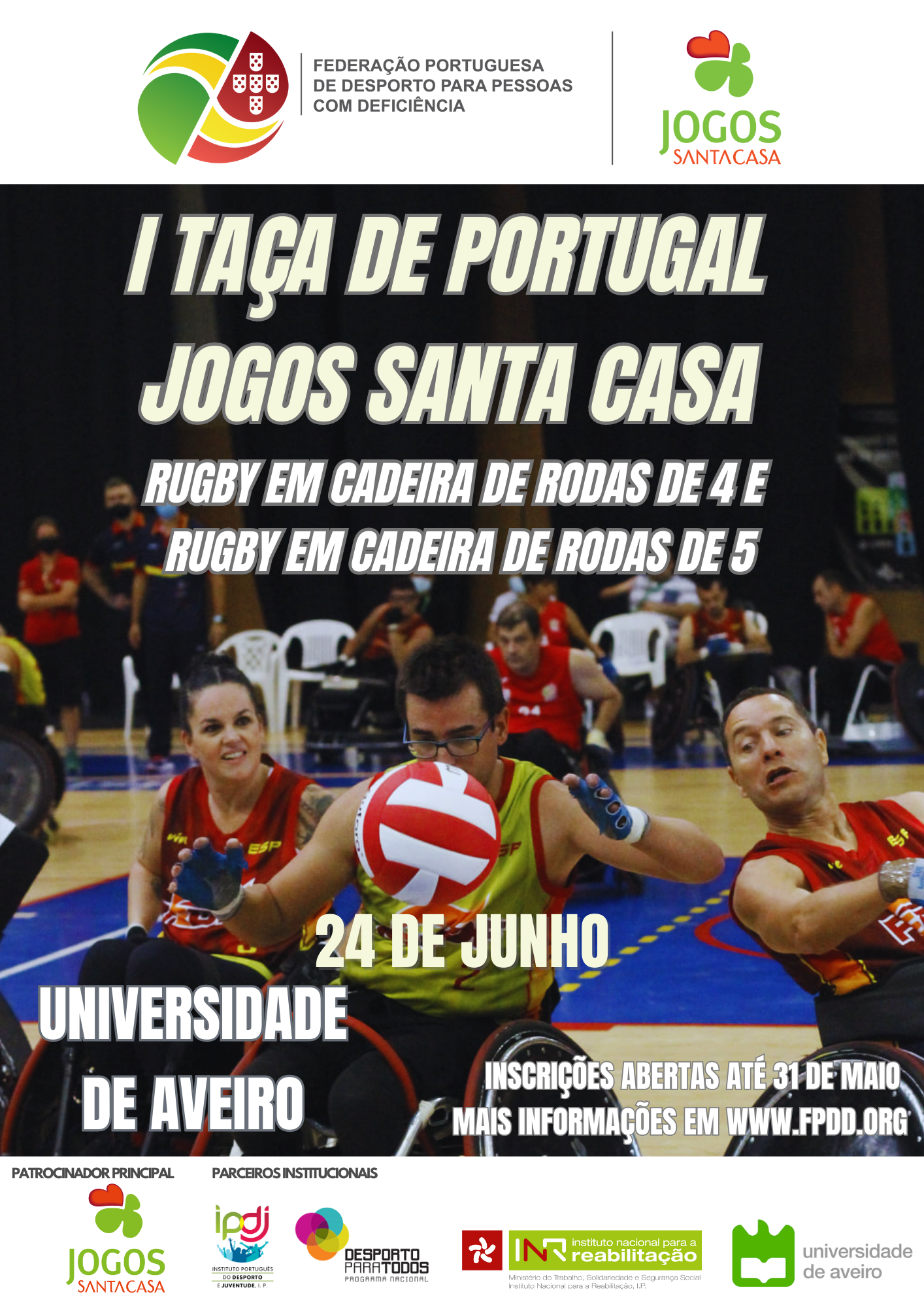 A Federação Portuguesa de Desporto para Pessoas com Deficiência vai organizar a I Taça de Rugby em Cadeira de Rodas Jogos Santa Casa que se realiza no próximo dia 24 de junho no Pavilhão Professor Doutor Aristides Hall, da Universidade de Aveiro.