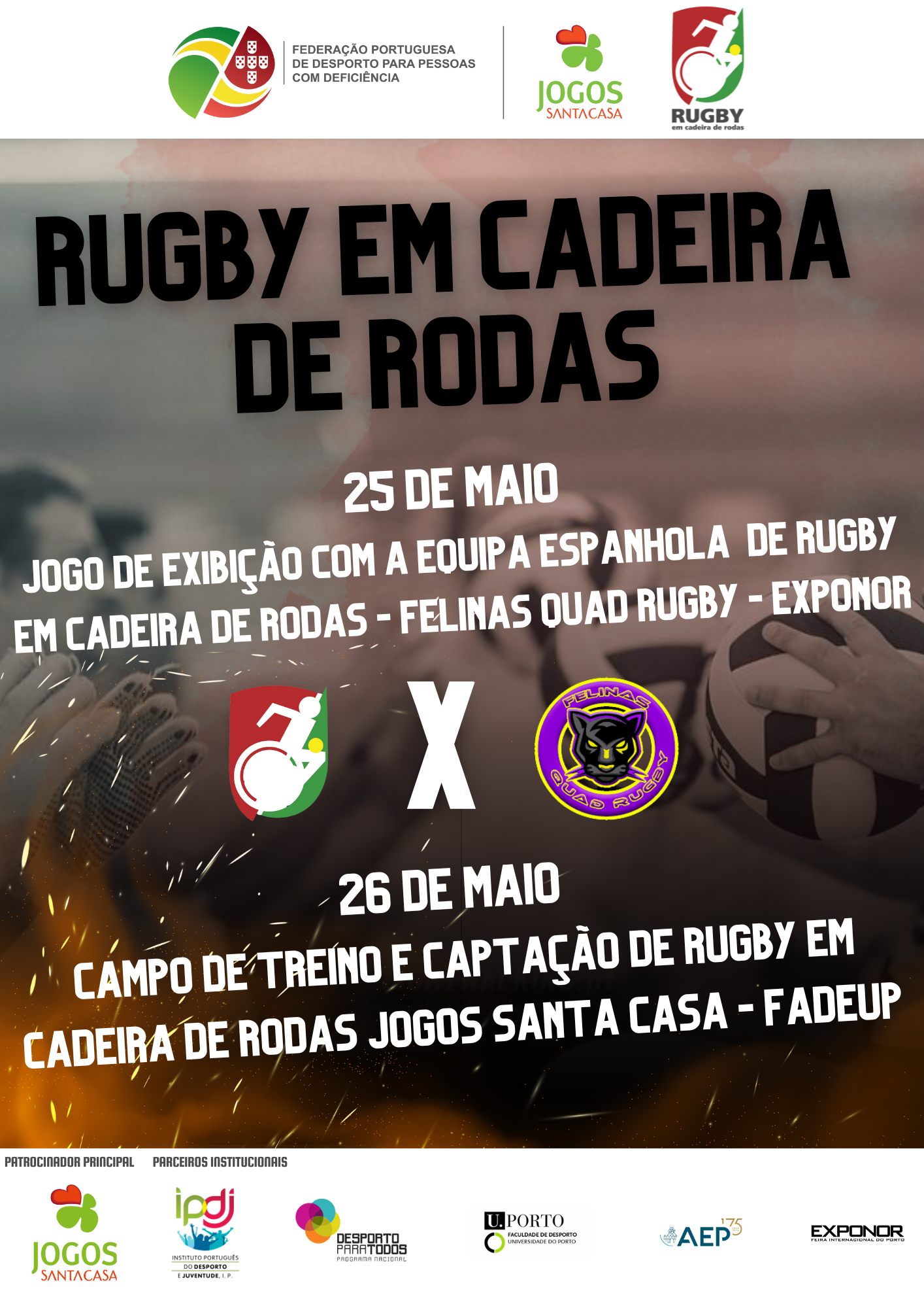 No âmbito do projeto “Rugby Sobre Rodas”, a Federação Portuguesa de Desporto para Pessoas com Deficiência (FPDD) realizará, com o apoio da Exponor e da Faculdade de Desporto da Universidade do Porto (FADEUP), o “II Campo de Treino Nacional de Rugby em Cadeira de Rodas Jogos Santa Casa – Estágio Nacional 2024”. O evento ocorrerá nos dias 25 e 26 de maio, na Exponor e na FADEUP, respectivamente.