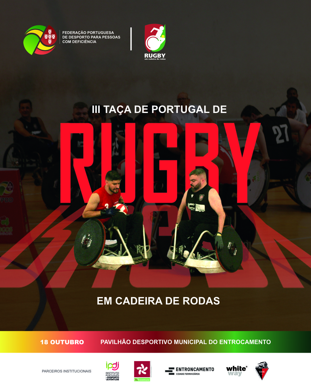 A Federação Portuguesa de Desporto para Pessoas com Deficiência (FPDD) tem o prazer de anunciar a realização da terceira edição da “Taça de Portugal de Rugby em Cadeira de Rodas” nas vertentes de Rugby CR 4 e Rugby CR 5. Este evento está marcado para o dia 18 de outubro no Pavilhão Desportivo Municipal do Entroncamento, com as inscrições abertas até o dia 13 de outubro para todos os interessados.