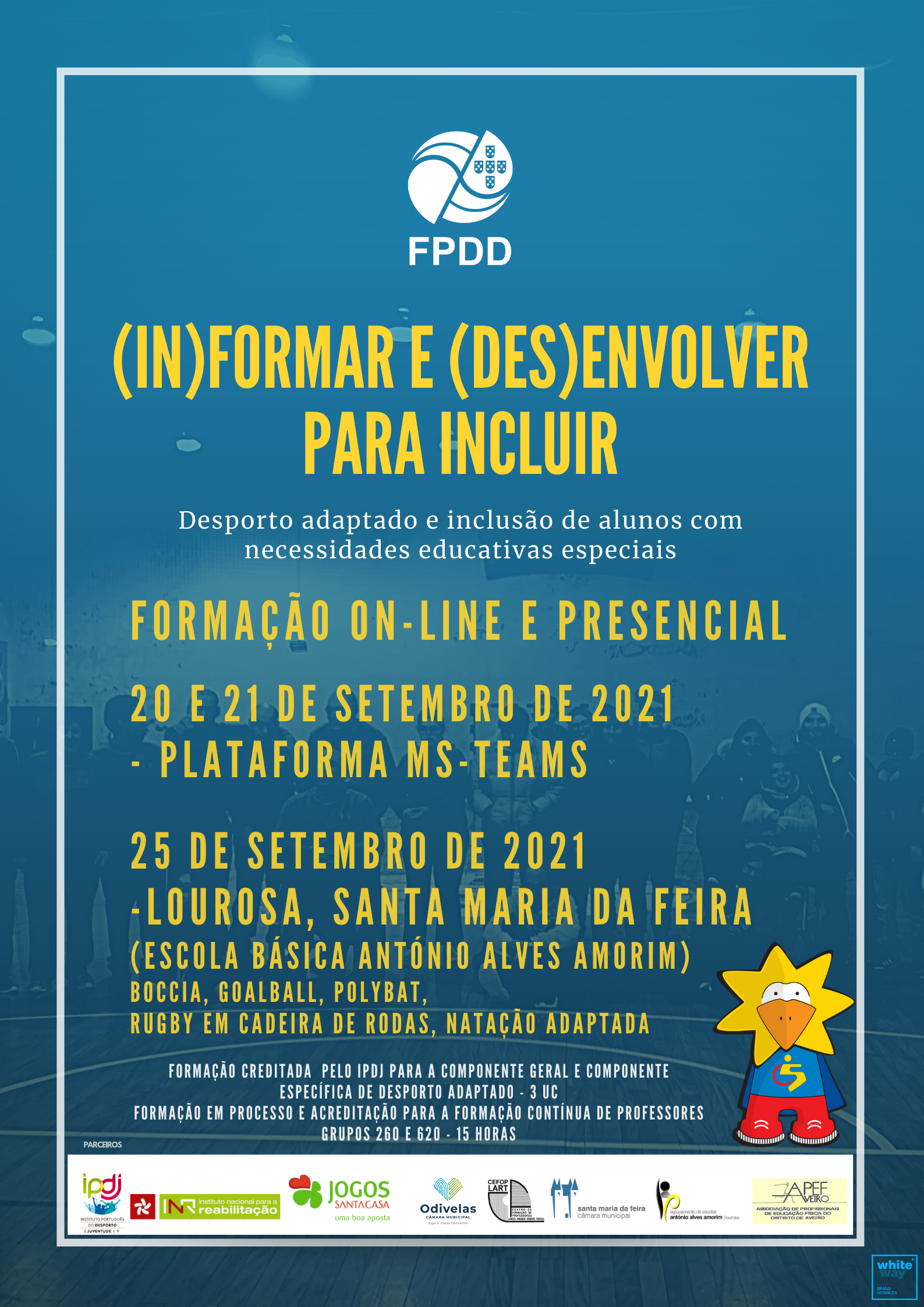 A FPDD regressa ao Distrito de Aveiro para mais uma ação do seu Projeto (In)formar e (Des)envolver para Incluir, desta feita em Lourosa, no Concelho de Santa Maria da Feira, onde teremos um Primeiro Momento com a AÇÃO DE FORMAÇÃO: “INICIAÇÃO À ATIVIDADE FÍSICA E DESPORTIVA EM CRIANÇAS E JOVENS COM NEE” destinada a Professores e Técnicos Desportivos, que terá dois módulos on-line nos 20 e 21 de setembro, um módulo presencial no dia 25 de setembro, na Escola António Alves Amorim (Lourosa), e um quarto módulo de avaliação (on-line) no dia 25 de outubro. Esta formação abordará aspetos globais ligados à pratica de desporto e atividade física por Pessoas com Deficiência, modelos e estratégias de trabalho na aula de Educação Física para a Deficiência Motora, Auditiva, Visual, Dificuldade Intelectual e Desenvolvimental e Paralisia Cerebral. Serão abordadas as modalidades de Boccia, Goalball, Polybat, Rugby em Cadeira de Rodas e Natação Adaptada. Esta ação de formação está em processo de Acreditação para Professores e para Treinadores de Desporto Adaptado.