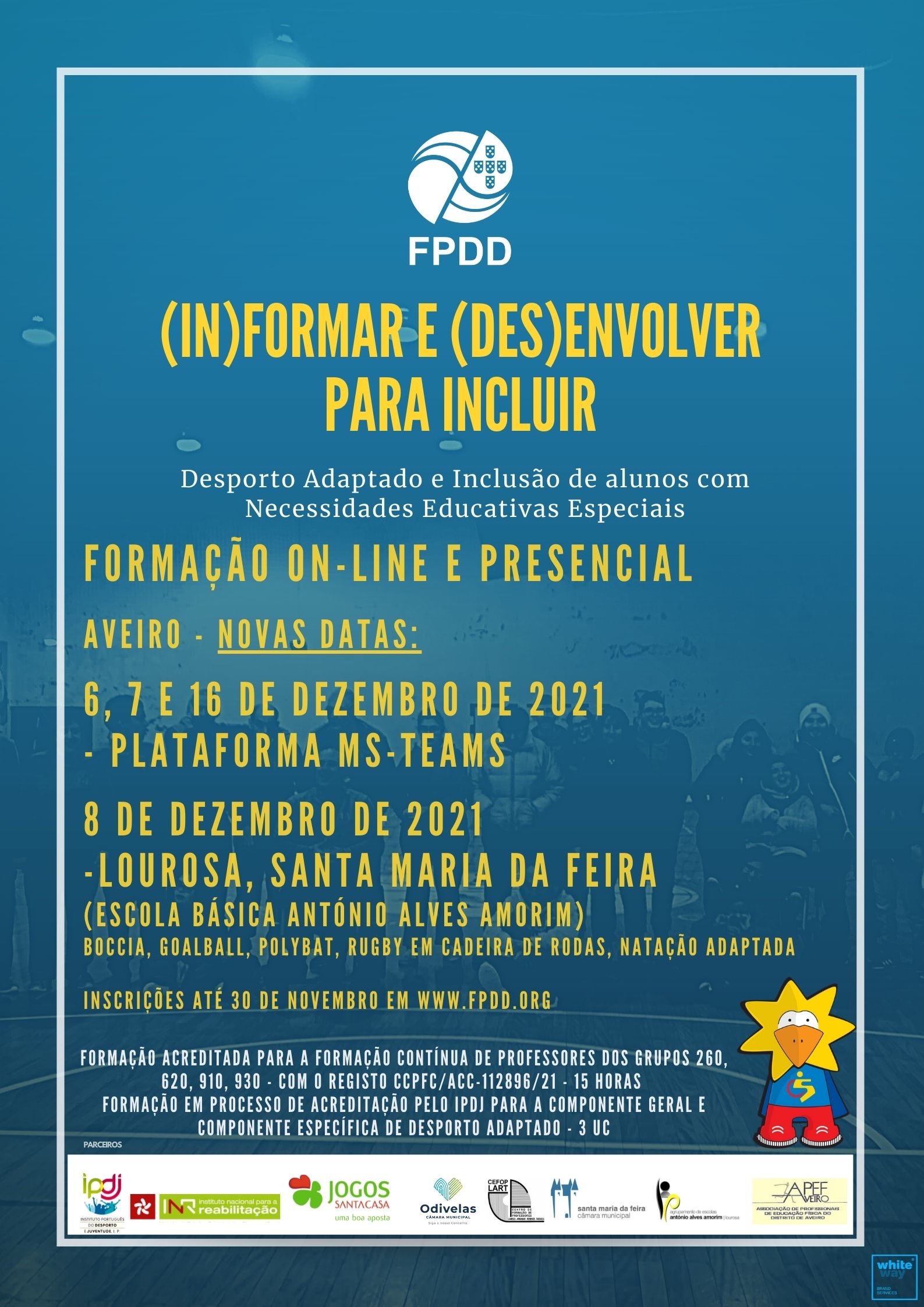Após o adiamento em setembro, a FPDD regressa ao Distrito de Aveiro para mais uma ação do seu Projeto (In)formar e (Des)envolver para Incluir, desta feita em Lourosa, no Concelho de Santa Maria da Feira, onde teremos um Primeiro Momento com a AÇÃO DE FORMAÇÃO: “INICIAÇÃO À ATIVIDADE FÍSICA E DESPORTIVA EM CRIANÇAS E JOVENS COM NEE” destinada a Professores e Técnicos Desportivos, que terá dois módulos on-line nos 6 e 7 de dezembro, um módulo presencial no dia 8 de dezembro, na Escola António Alves Amorim (Lourosa), e um quarto módulo de avaliação (on-line) no dia 16 de dezembro. Esta formação abordará aspetos globais ligados à pratica de desporto e atividade física por Pessoas com Deficiência, modelos e estratégias de trabalho na aula de Educação Física para a Deficiência Motora, Auditiva, Visual, Dificuldade Intelectual e Desenvolvimental e Paralisia Cerebral. Serão abordadas as modalidades de Boccia, Goalball, Polybat, Rugby em Cadeira de Rodas e Natação Adaptada. Esta ação de formação está Acreditada com 15 horas, para: Professores dos Grupos 260, 620, 910, 930 – Com o registo CCPFC/ACC-112896/21; Componente Específica do TPTD de Desporto Adaptado, e para a Componente Geral (em processo de Acreditação).