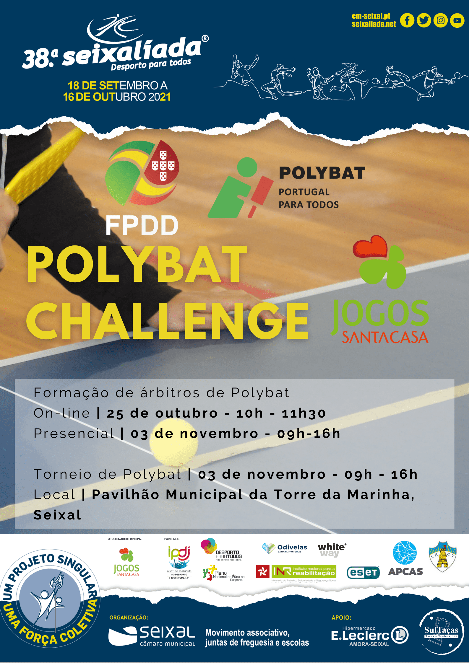 No âmbito do projeto “Polybat Challenge”, a Federação Portuguesa de Desporto para Pessoas com Deficiência (FPDD) vai realizar um Torneio de Polybat “Jogos Santa Casa”, no dia 03 de novembro, das 09h00 às 16h00, no Pavilhão Municipal da Torre da Marinha no Seixal, um torneio que não podia deixar de ter com parceiro a Camara Municipal Seixal e da APCAS no âmbito da 38.ª Seixalíadia.