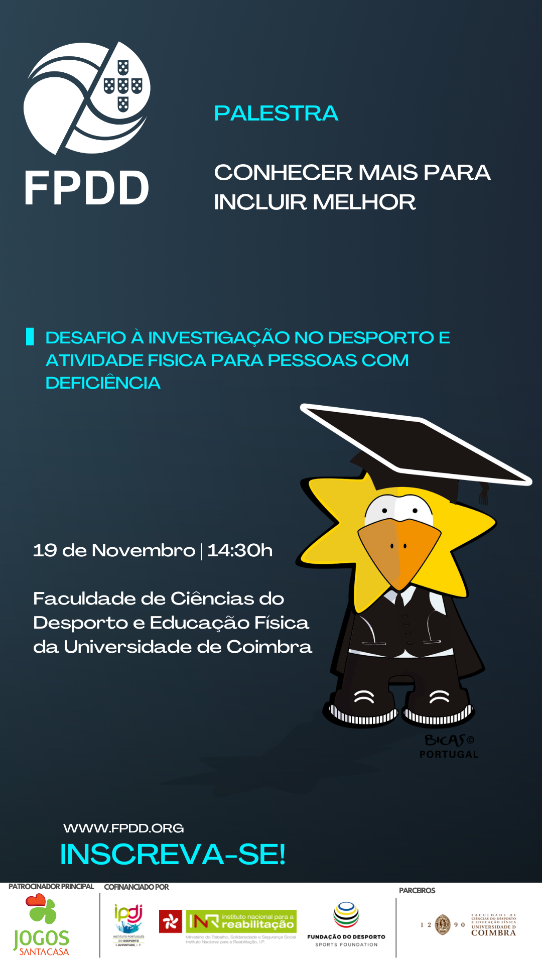 A FPDD irá levar a cabo mais uma ação do Projeto “Conhecer Mais para Incluir Melhor” de 2022, através de uma palestra que pretende desafiar Professores, Alunos e Investigadores a realizar trabalhos no âmbito do Desporto e Atividade Física para Pessoas com Deficiência e Incapacidade, visando o incremento do conhecimento científico nesta área.