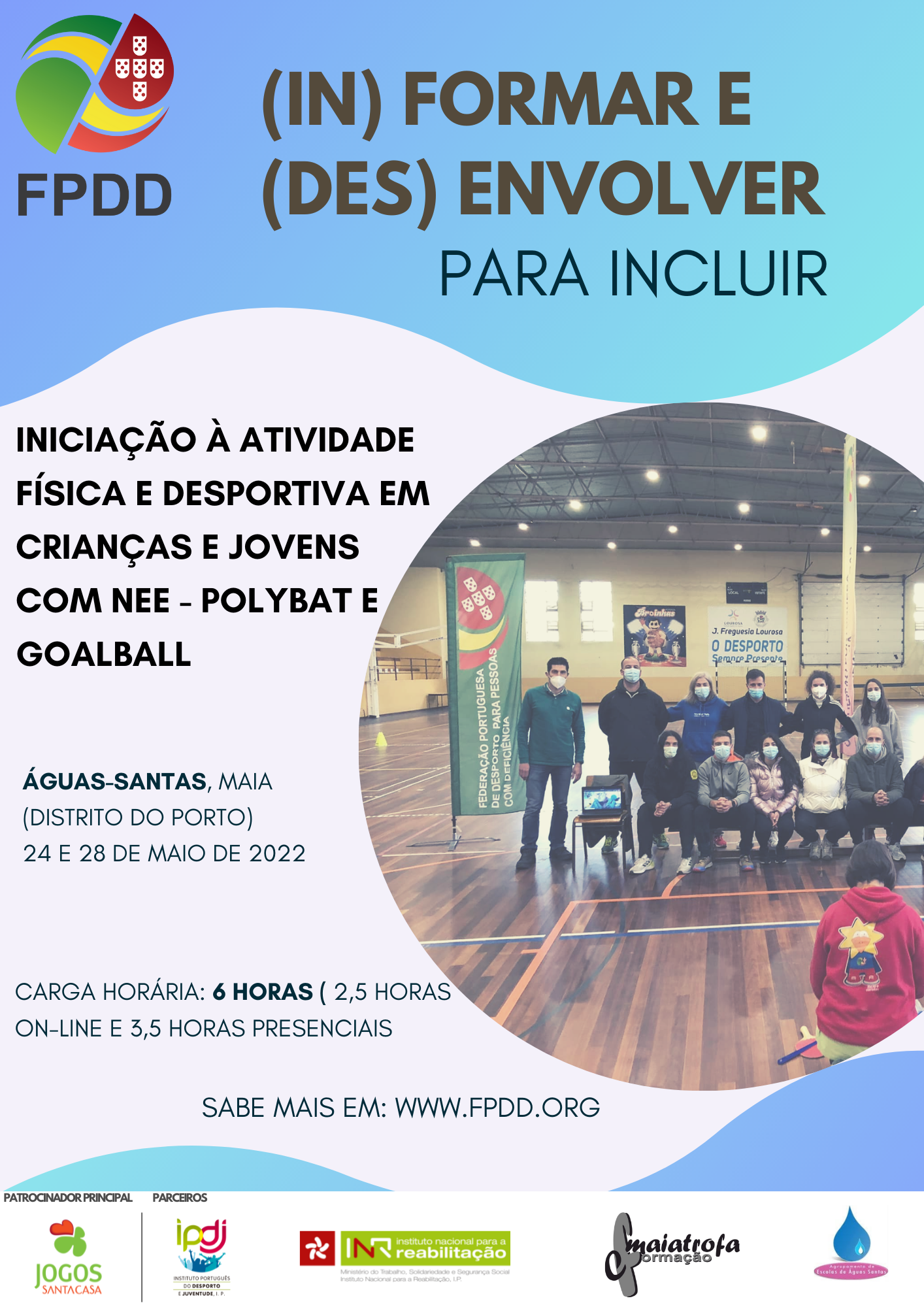A FPDD irá promover a Ação de Formação de Curta Duração “Iniciação à Atividade Física e Desportiva em Crianças e Jovens com NEE – Polybat e Goalball” em Águas Santas (Maia), numa parceria com o Agrupamento de Escolas local. Terá uma carga horária de 6 horas, com uma componente on-line no dia 24 de maio e uma prática presencial no dia 28 de maio, na Escola Básica e Secundária de Águas Santas.