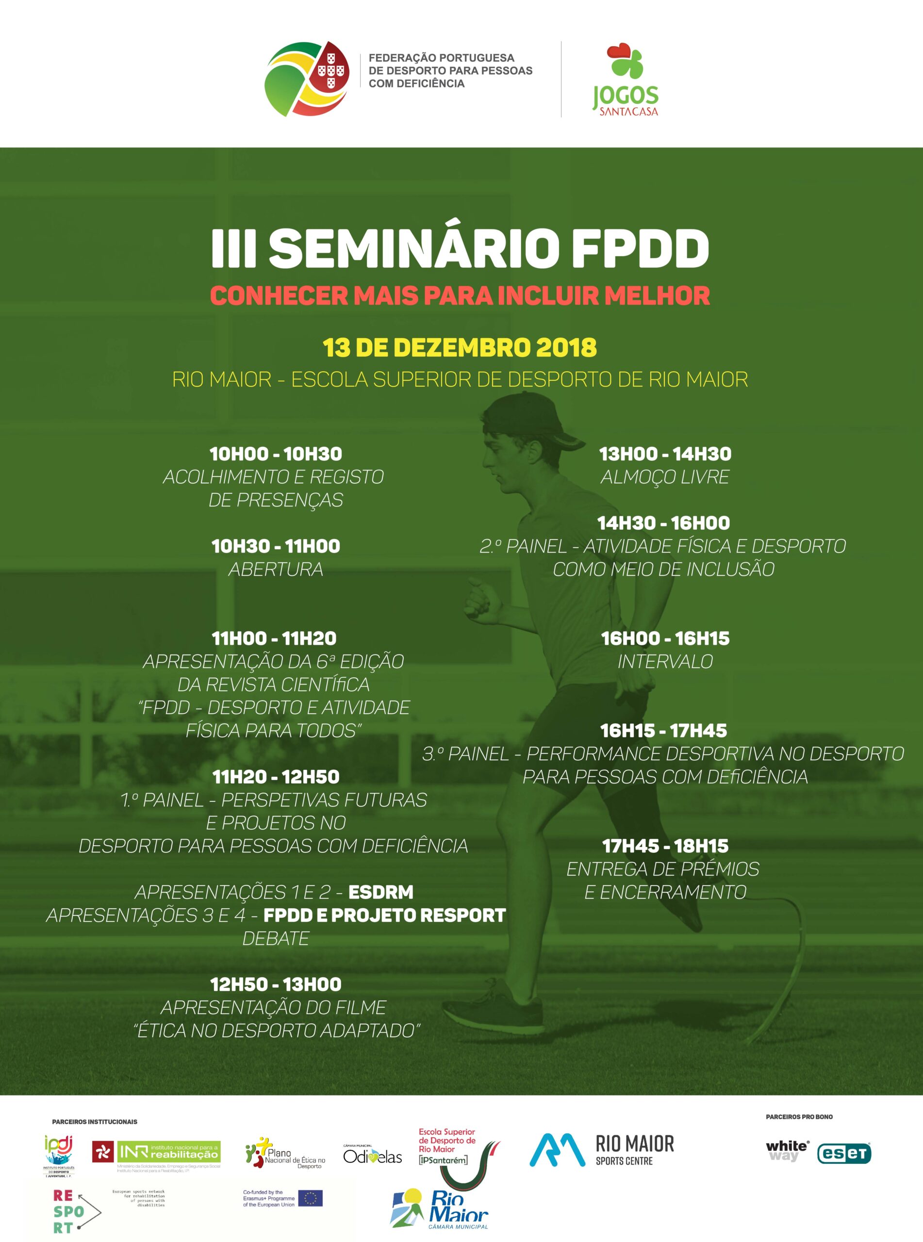 É já na quinta-feira, 13 de dezembro, que a Escola Superior de Desporto de Rio Maior acolherá a terceira edição do Seminário da FPDD “Conhecer Mais para Incluir Melhor”. Este ano esta ação coincidirá com o ReSport International Seminar no âmbito do projeto ReSport, do Programa Erasmus +, da Comissão Europeia.
