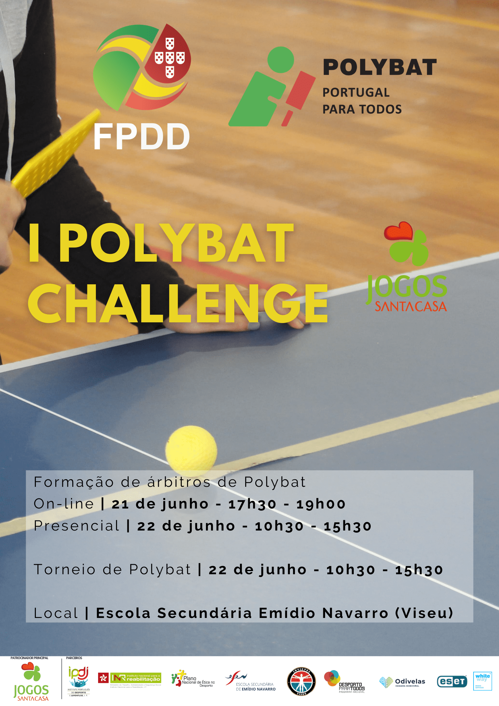 No âmbito do projeto Polybat Challenge”, a Federação Portuguesa de Desporto para Pessoas com Deficiência (FPDD) vai realizar um Torneio de Polybat “Jogos Santa Casa”, no dia 22 de junho, das 10h30 às 15h30, na Escola Secundária Emídio Navarro na cidade de Viseu e conta com a parceria da associação Invictus Viseu.
