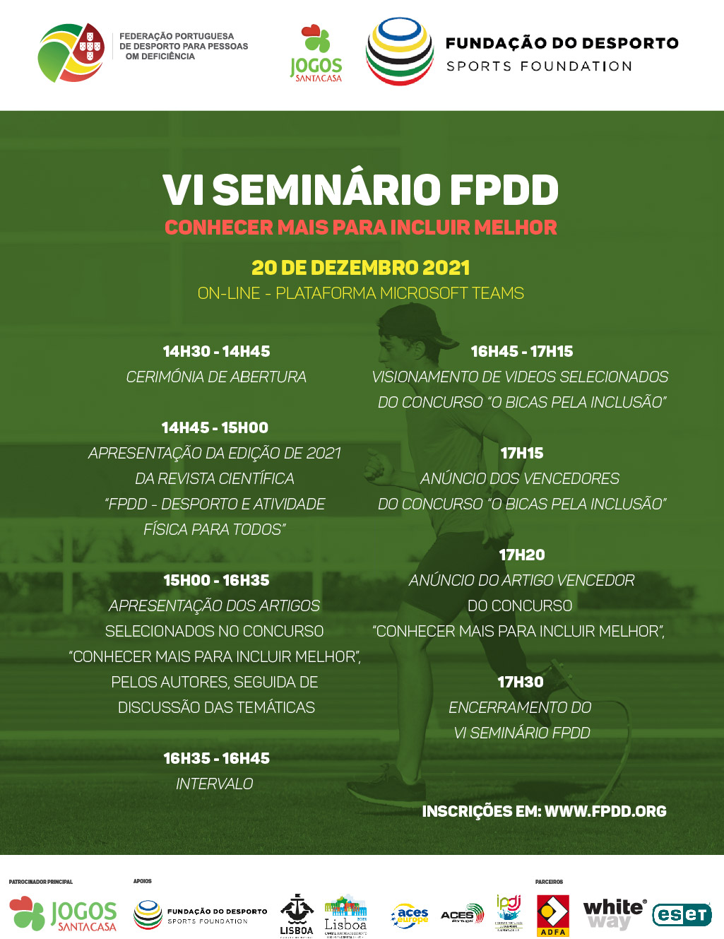A Federação Portuguesa de Desporto para Pessoas com Deficiência vai realizar, no dia 20 de dezembro de 2021 (segunda-feira), a partir das 14h30, o VI Seminário da FPDD “Conhecer Mais para Incluir Melhor”, integrado na “Lisboa Capital Europeia do Desporto”.